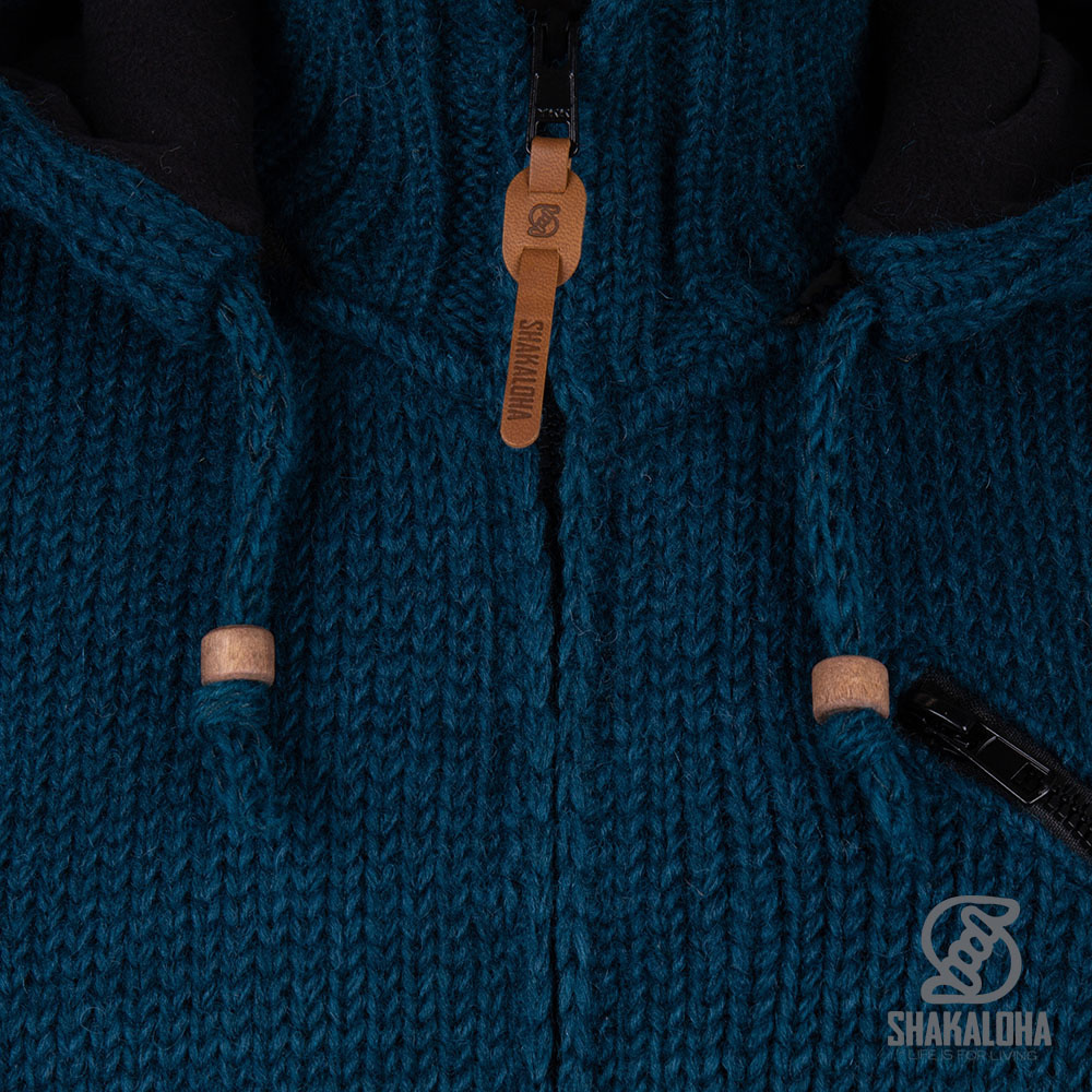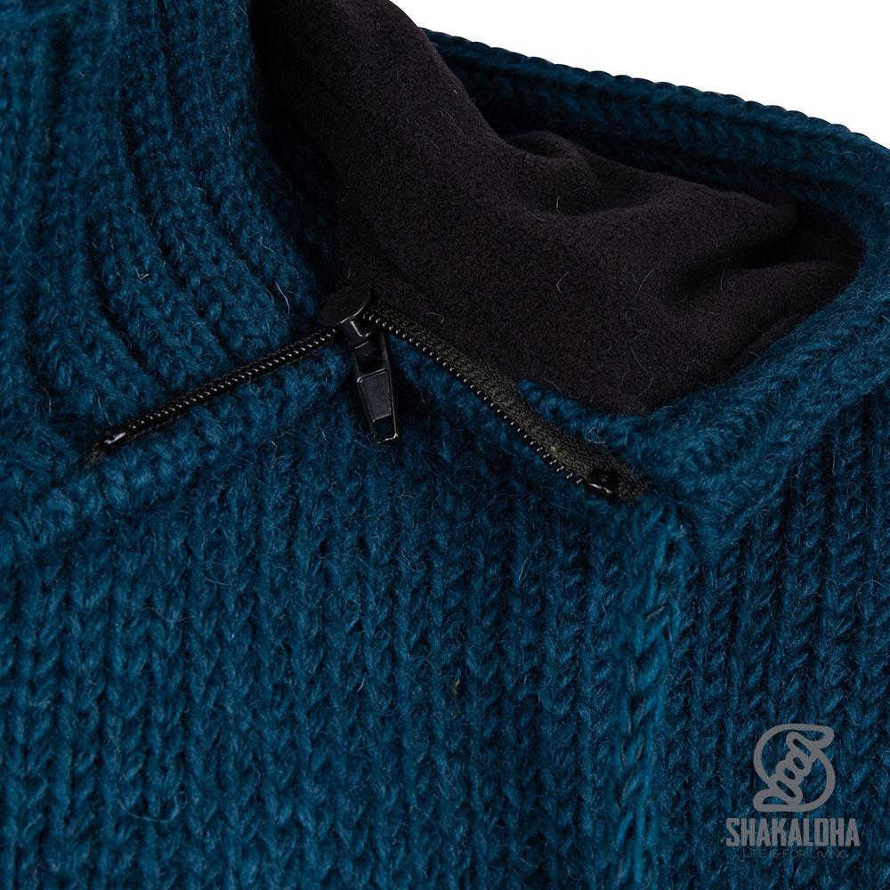 Gilet in lana blu petrolio con tasche laterali e cappuccio staccabile con cerniera. Il gilet è foderato in nylon antivento sul davanti e sulle maniche, e in morbido pile su schiena, colletto e cappuccio. Il meglio di entrambi i mondi! Un gilet fantastico per i ciclisti!