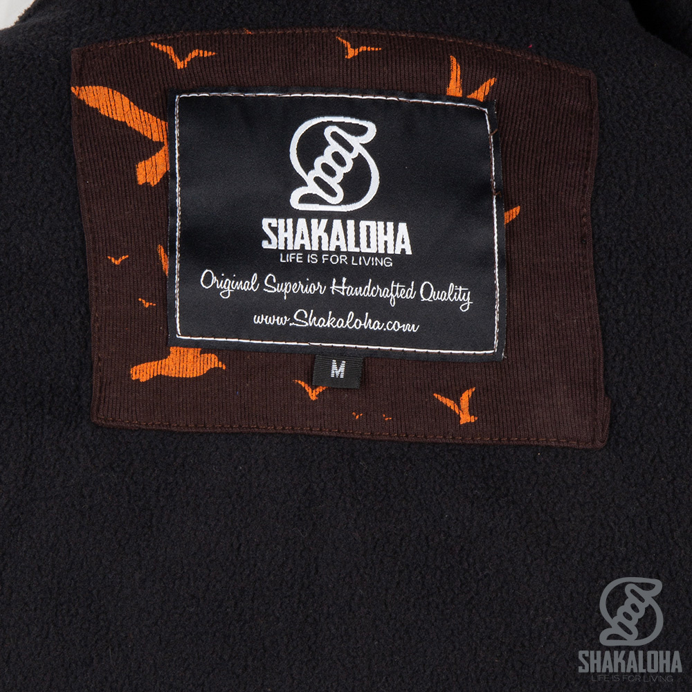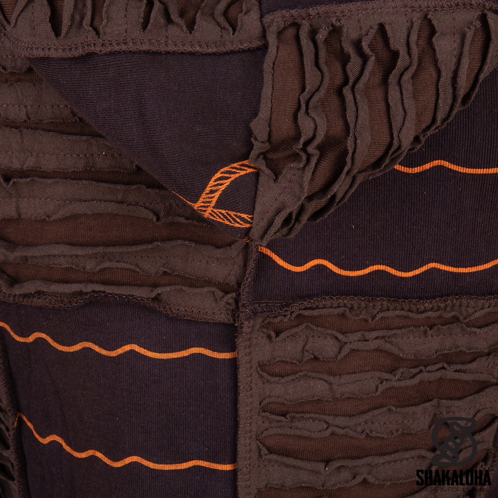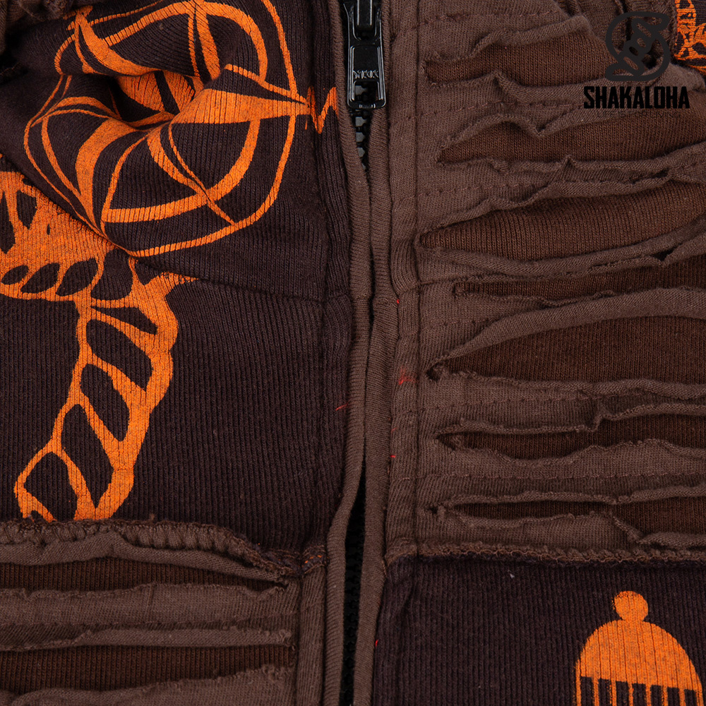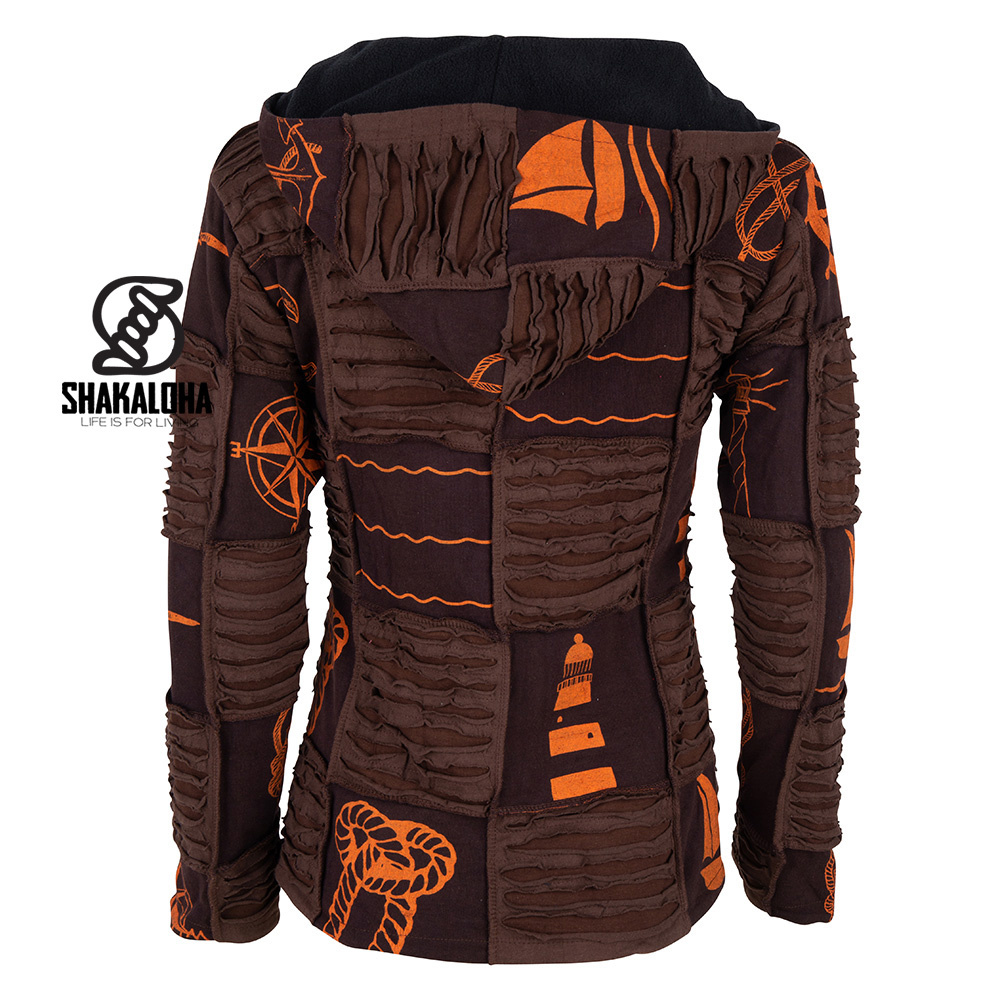 Deliziosa giacca da donna in cotone marrone con tema "mare" e motivi arancioni con nodi di nave, ancore, barche, gabbiani e onde. La giacca è completamente foderata in caldo e morbido pile e presenta due tasche laterali, un cappuccio e una cerniera resistente.