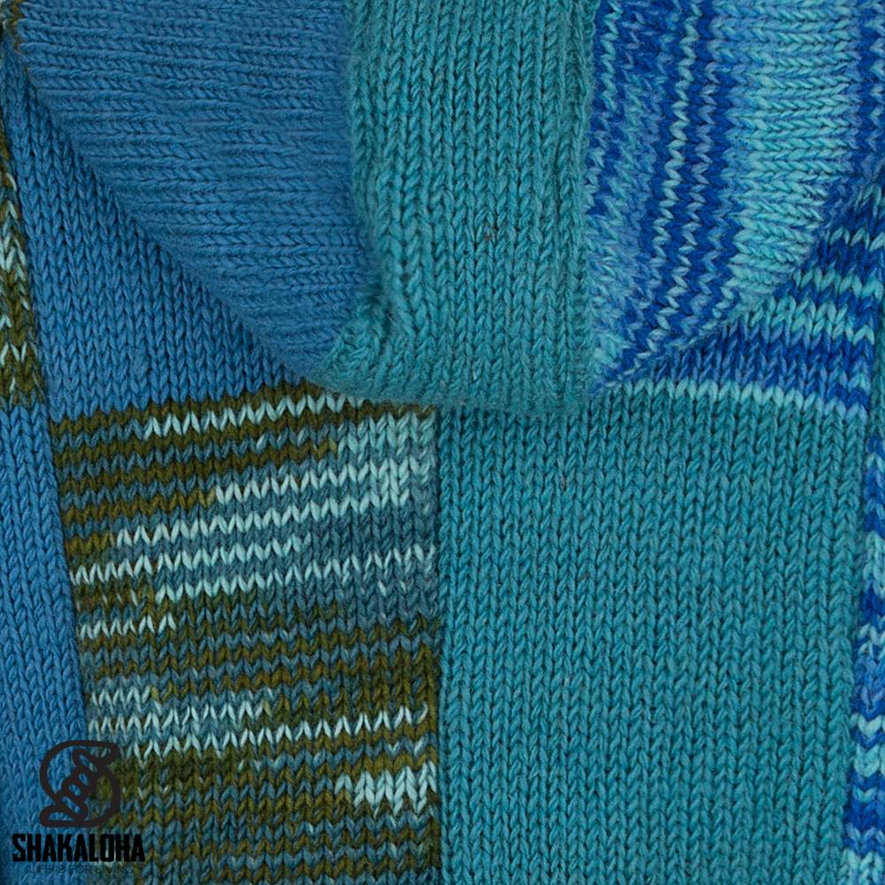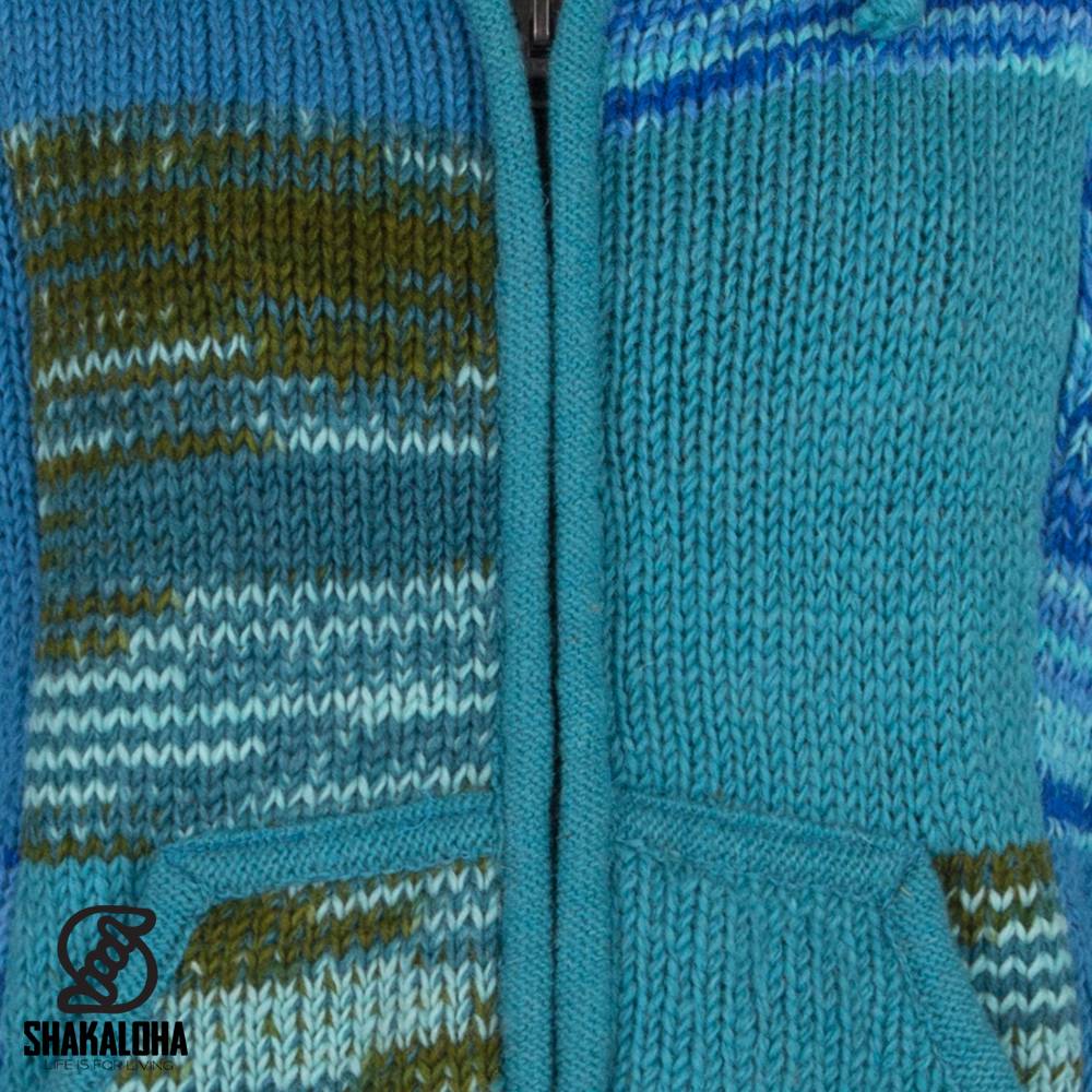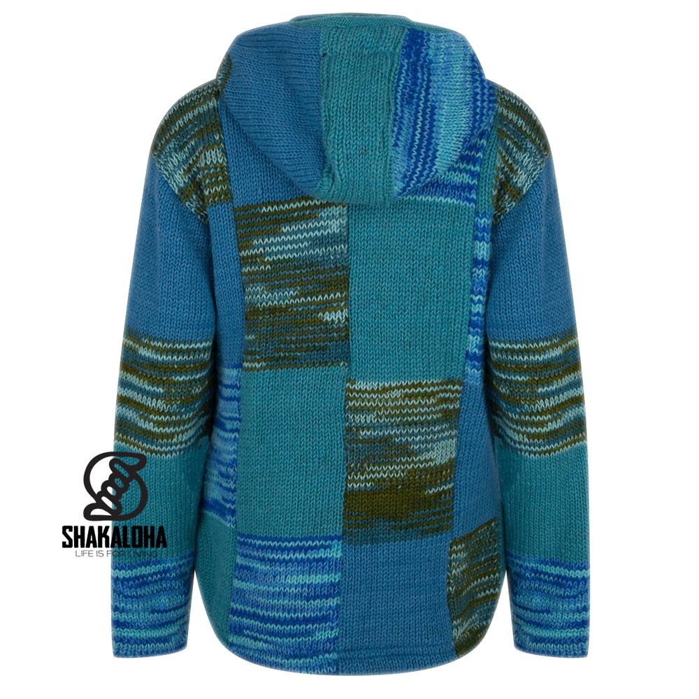 Caldo gilet da donna con motivo patchwork caratterizzato da vari pannelli blu, tra cui azzurro, turchese e verde. Il gilet ha un cappuccio fisso ed è foderato in pile su tutto il corpo, maniche, cappuccio e tasche. Questo caldo gilet ha tasche laterali e una tasca interna chiudibile, e le cerniere sono prodotte da YKK, a garanzia di una qualità impeccabile. Questo gilet meravigliosamente caldo può essere indossato come giacca in inverno, ma è anche molto comodo nelle fresche giornate estive. Disponibile nelle taglie dalla S alla 3XL e in diverse combinazioni di colori, è disponibile anche nella versione da uomo. I gilet Shakaloha sono realizzati in lana di pecora neozelandese al 100% e sono prodotti in Nepal nel rispetto sia degli animali che dei lavoratori. I gilet possono essere lavati con un po' di detersivo per lana, con un ciclo per lana a 30 gradi.