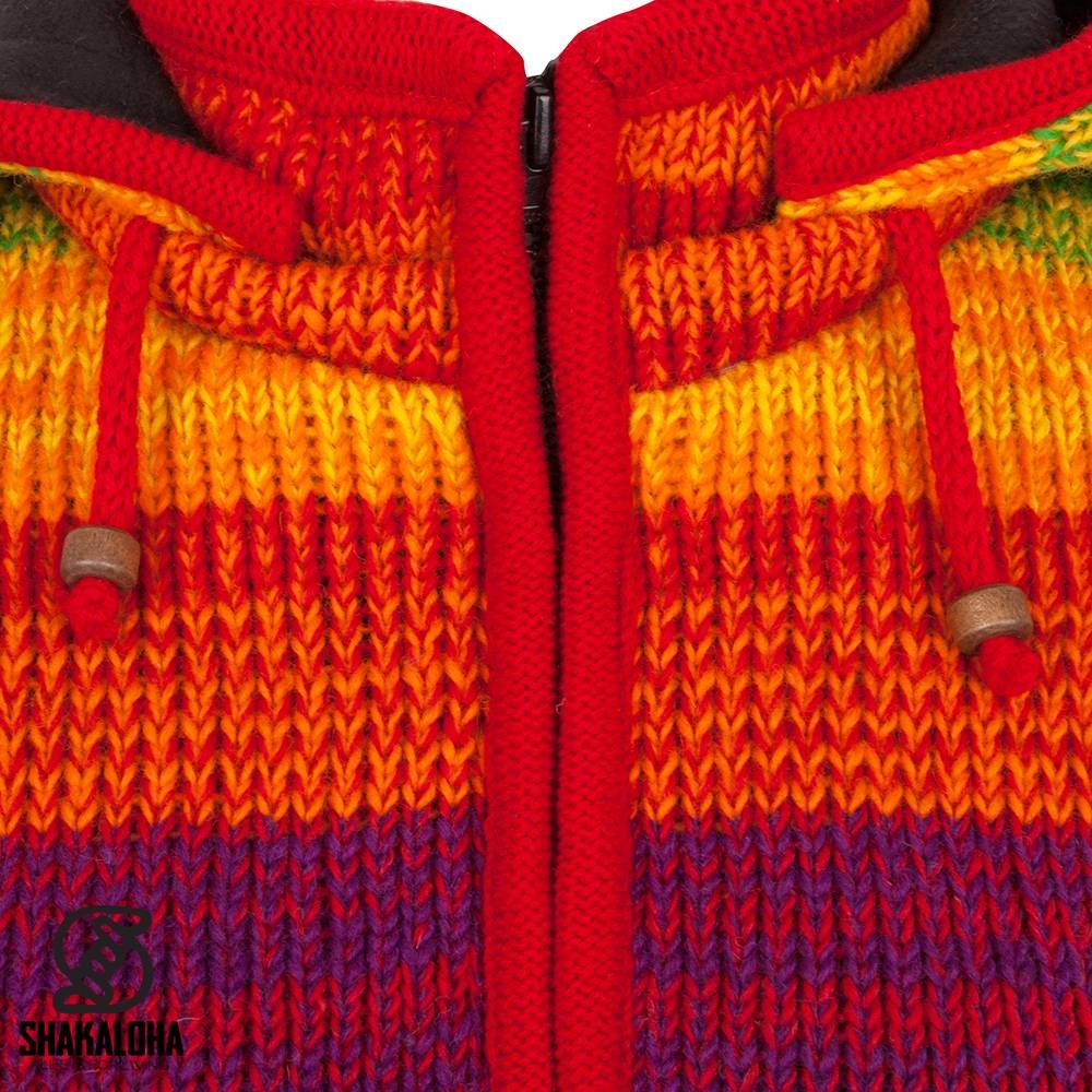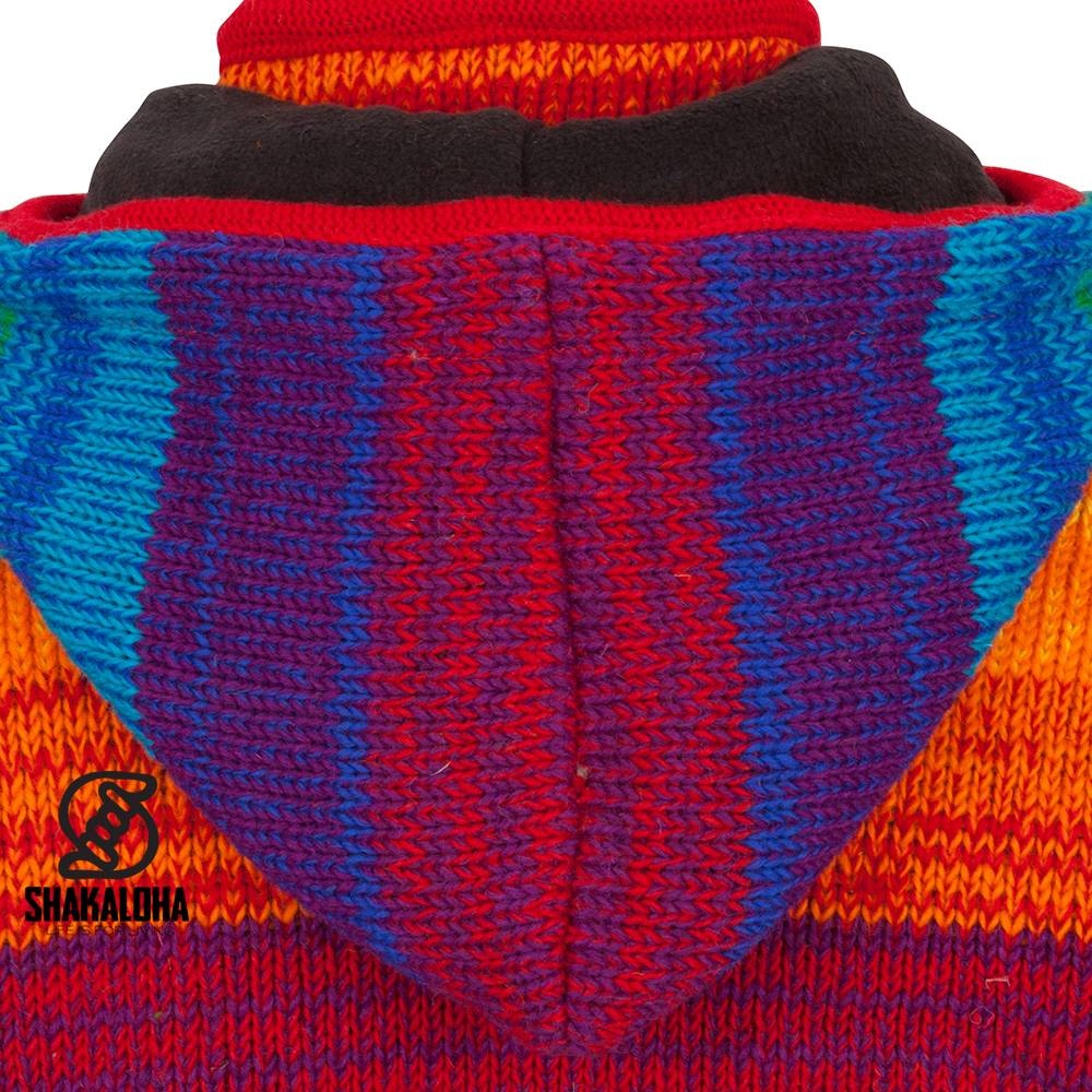 Un sorprendente cardigan da donna in lana lavorato a maglia di Shakaloha con motivo arcobaleno e colori vivaci. Lavorato a maglia in Nepal con lana neozelandese, il cardigan è interamente foderato in pile, per evitare qualsiasi fastidio. Presenta un colletto con cappuccio staccabile, tasche a marsupio e una tasca interna.