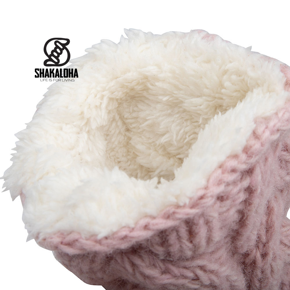 Pantofole Shakaloha rosa, morbide e foderate in lana. Lavorate a mano in 100% lana di pecora con una speciale lavorazione a treccia e foderate in morbido tessuto effetto peluche. Le pantofole hanno una suola in pelle scamosciata antiscivolo. Fatte a mano in Nepal. Disponibili in diversi colori e con o senza suola in pelle scamosciata.