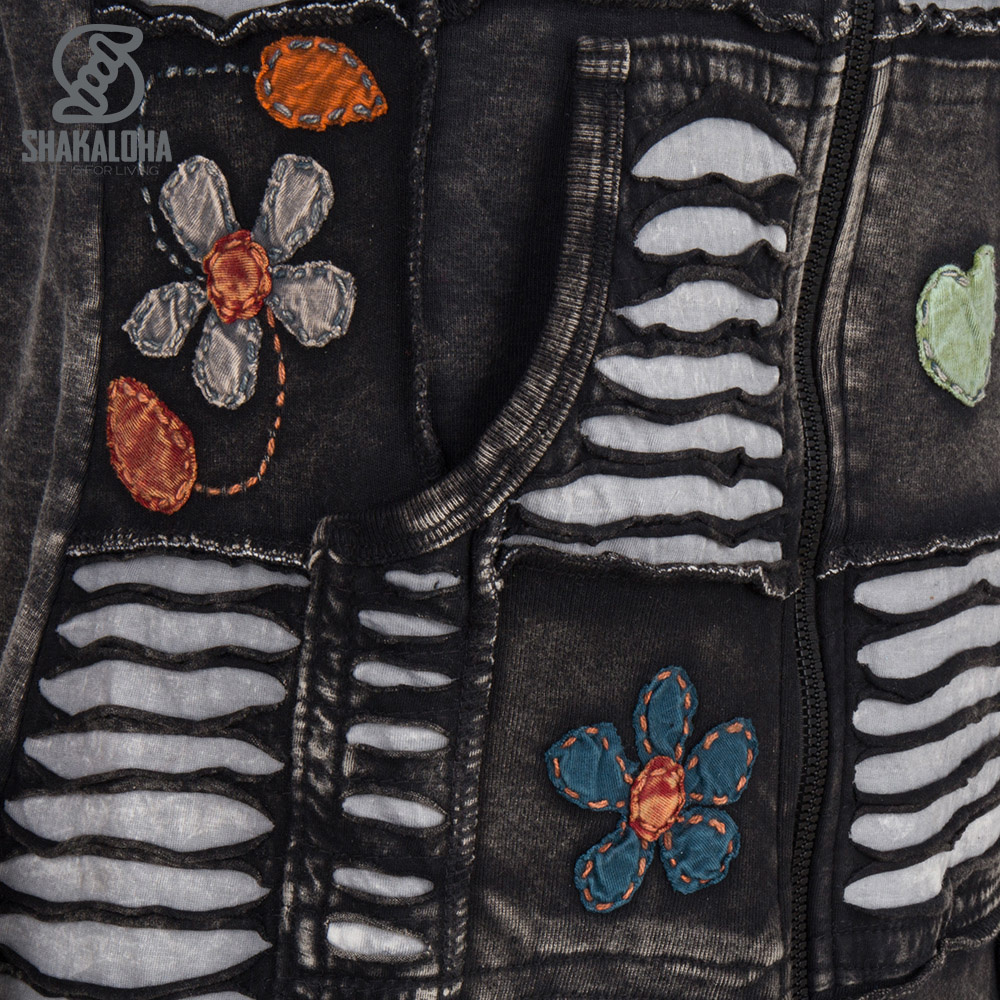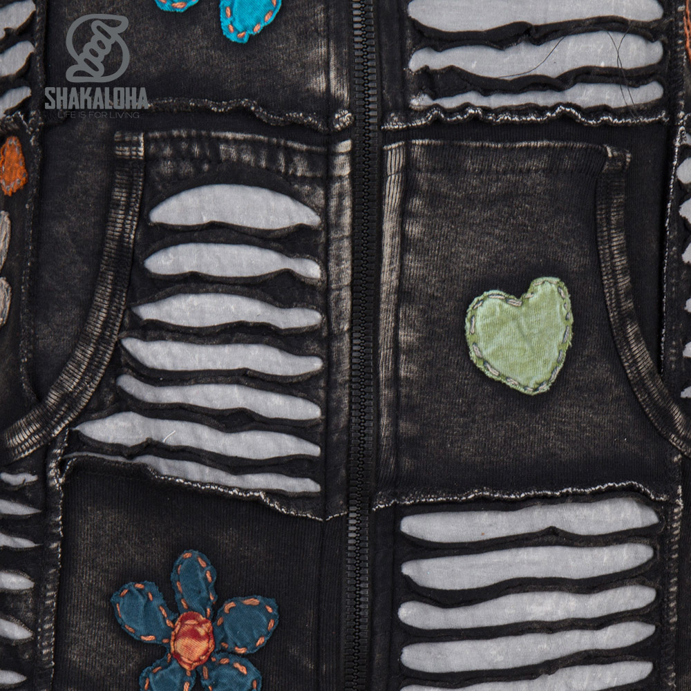 Giacca Shakaloha color antracite con dettagli beige giocosi, fiori colorati e cuori. Questa giacca arriva sotto i fianchi ed è foderata in morbido pile proveniente da fonti etiche. Presenta tasche laterali, una robusta cerniera e un cappuccio.