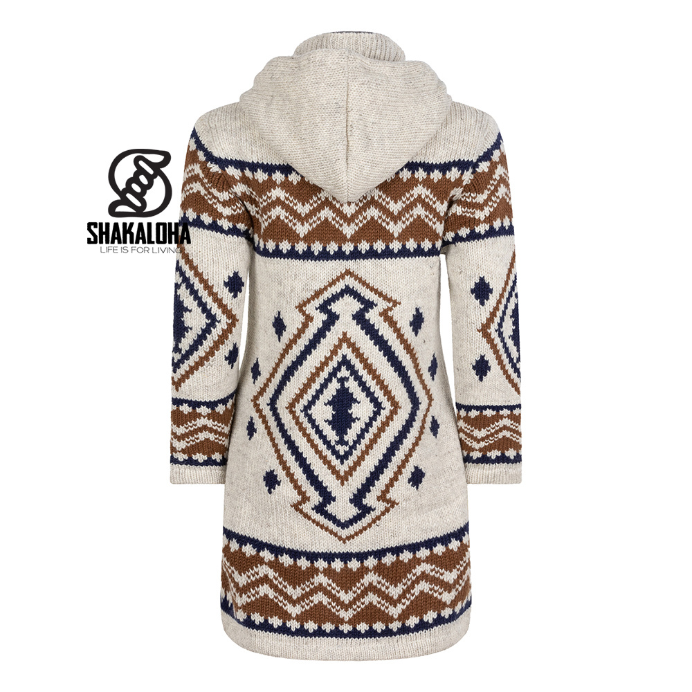 Scopri la combinazione perfetta di calore, comfort e stile con questo lungo cappotto da donna in lana di Shakaloha. Questo cappotto foderato in pile è pensato per le donne che apprezzano i materiali naturali e un look unico. Grazie al suo motivo etnico fatto a mano nei toni della terra e del blu intenso, questo cardigan è un vero colpo d'occhio.
