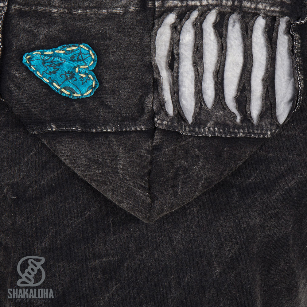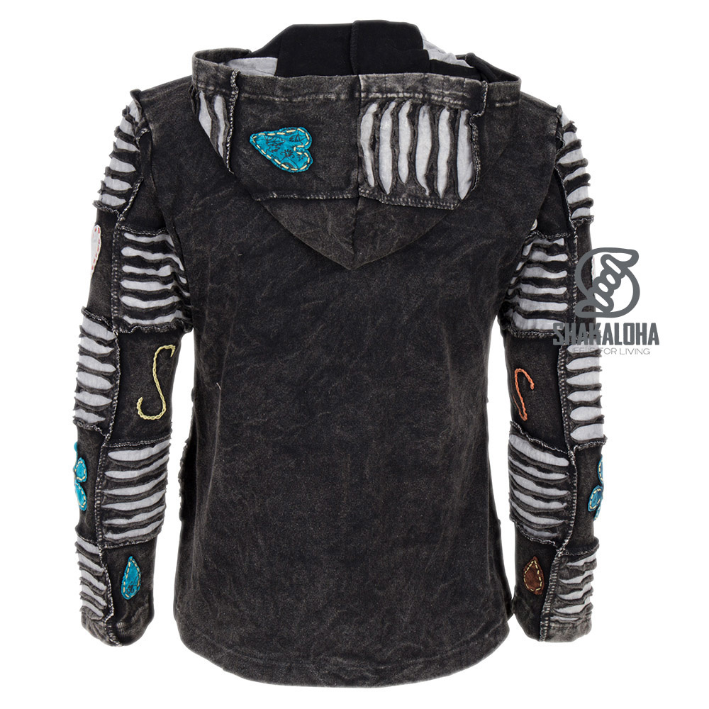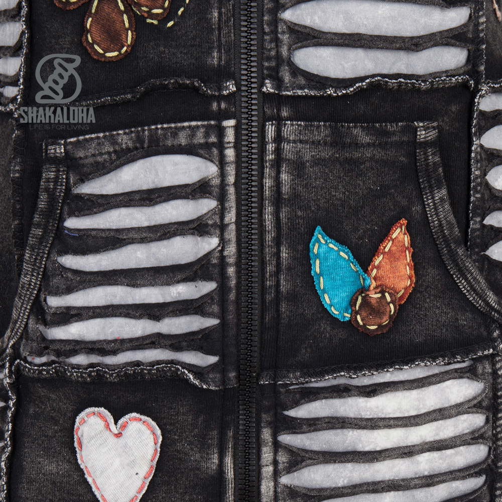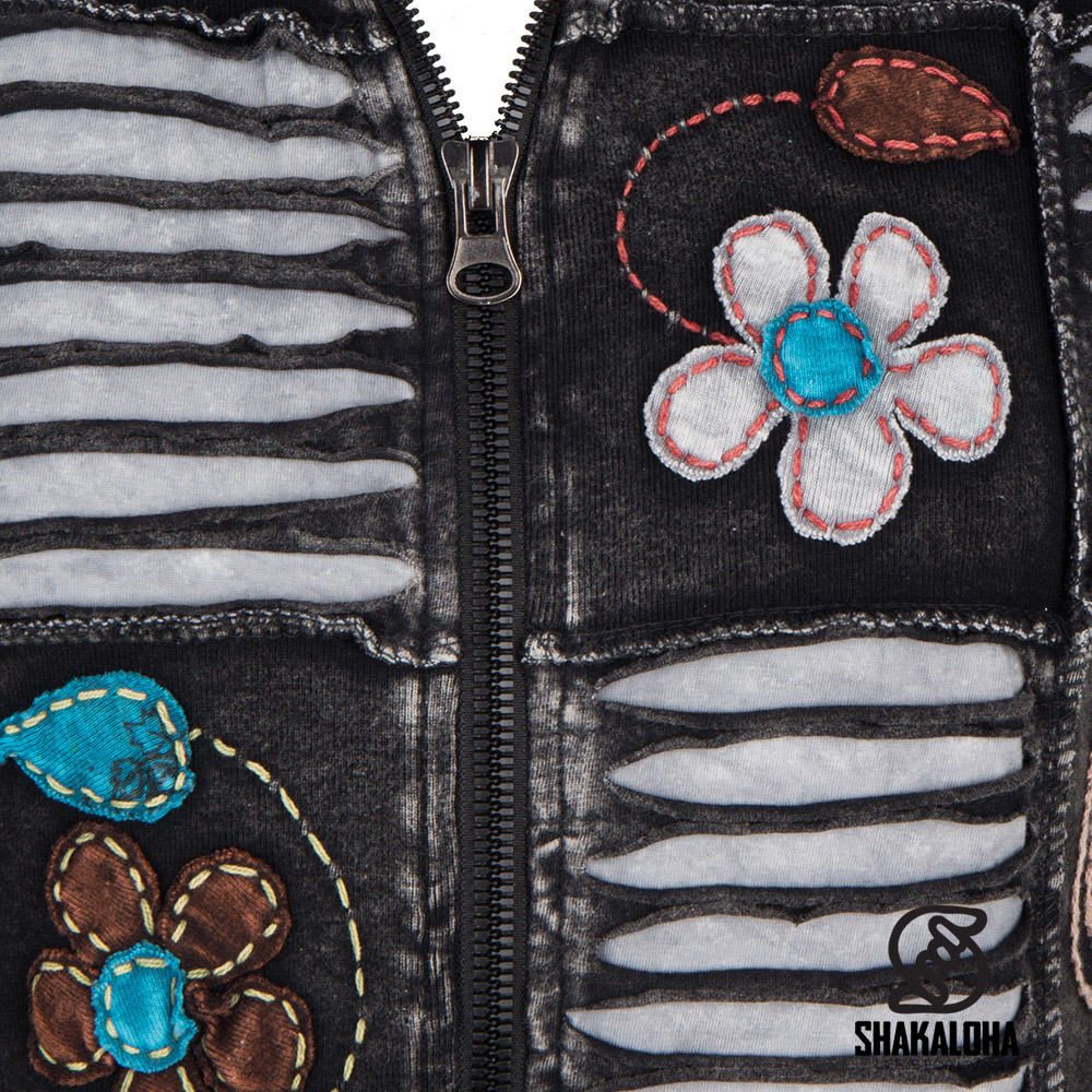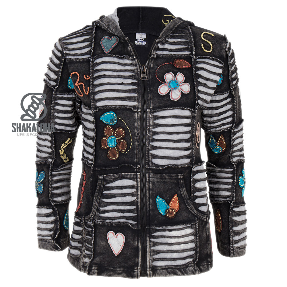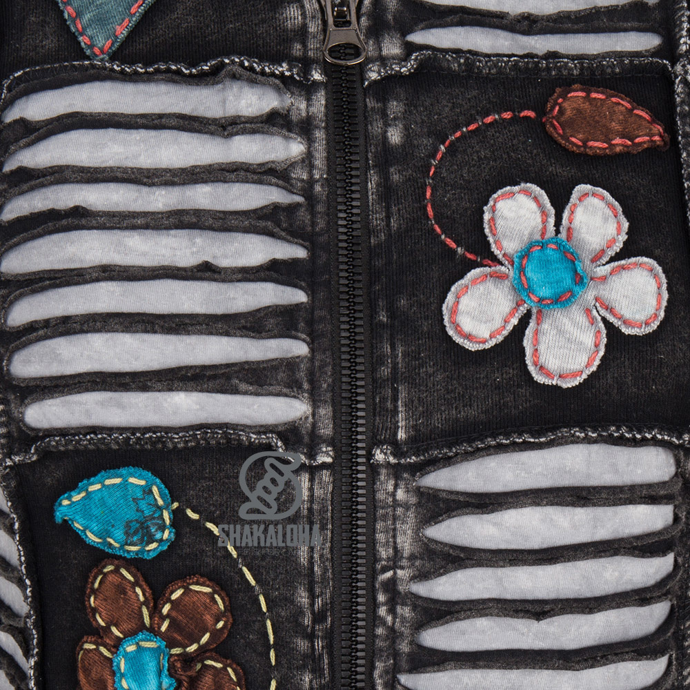Giacca in cotone grigio antracite, lunga fino ai fianchi, con dettagli beige giocosi, tra cui fiori. Adatta sia per interni che per esterni, la giacca è sfoderata e dotata di cappuccio. Prodotto in Nepal.