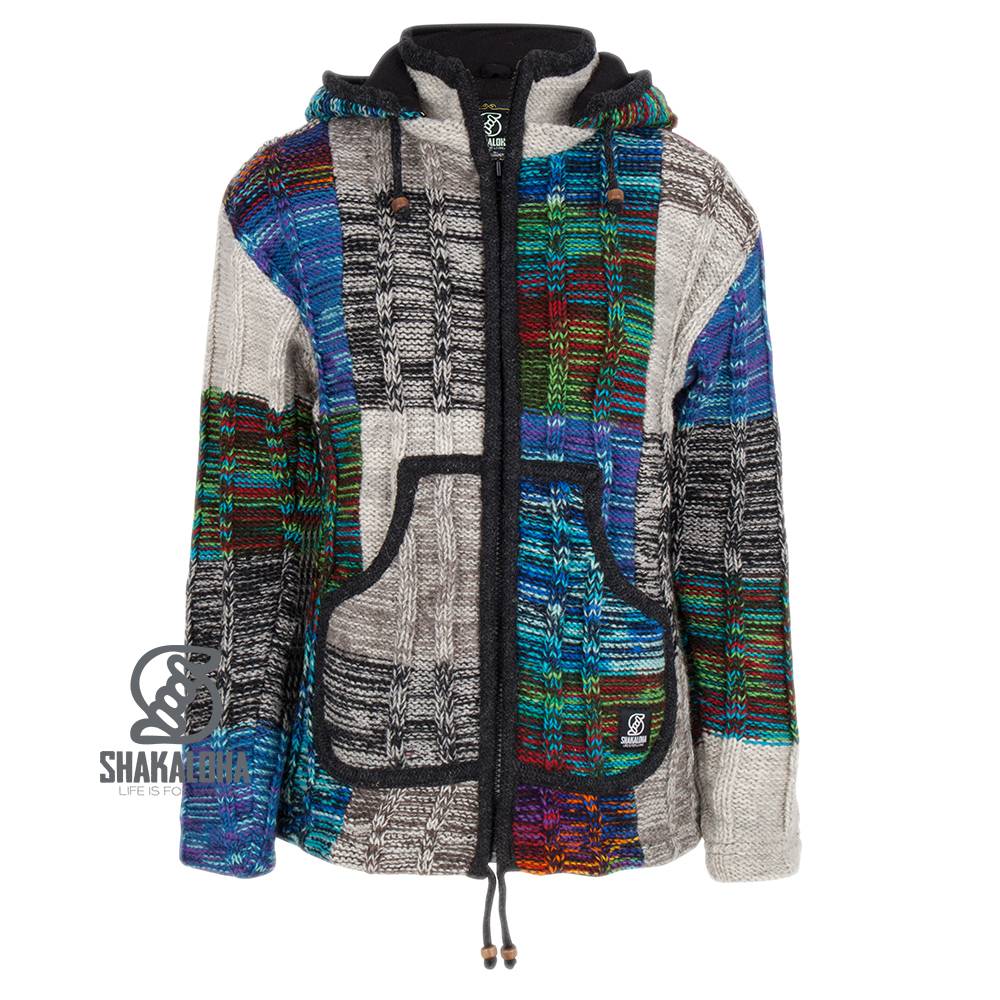 Gilet in lana lavorata a maglia Shakaloha con toppa a coste ZH, pelliccia mista multicolore con fodera in pile e cappuccio staccabile - Donna - Fatto a mano in Nepal con lana di pecora