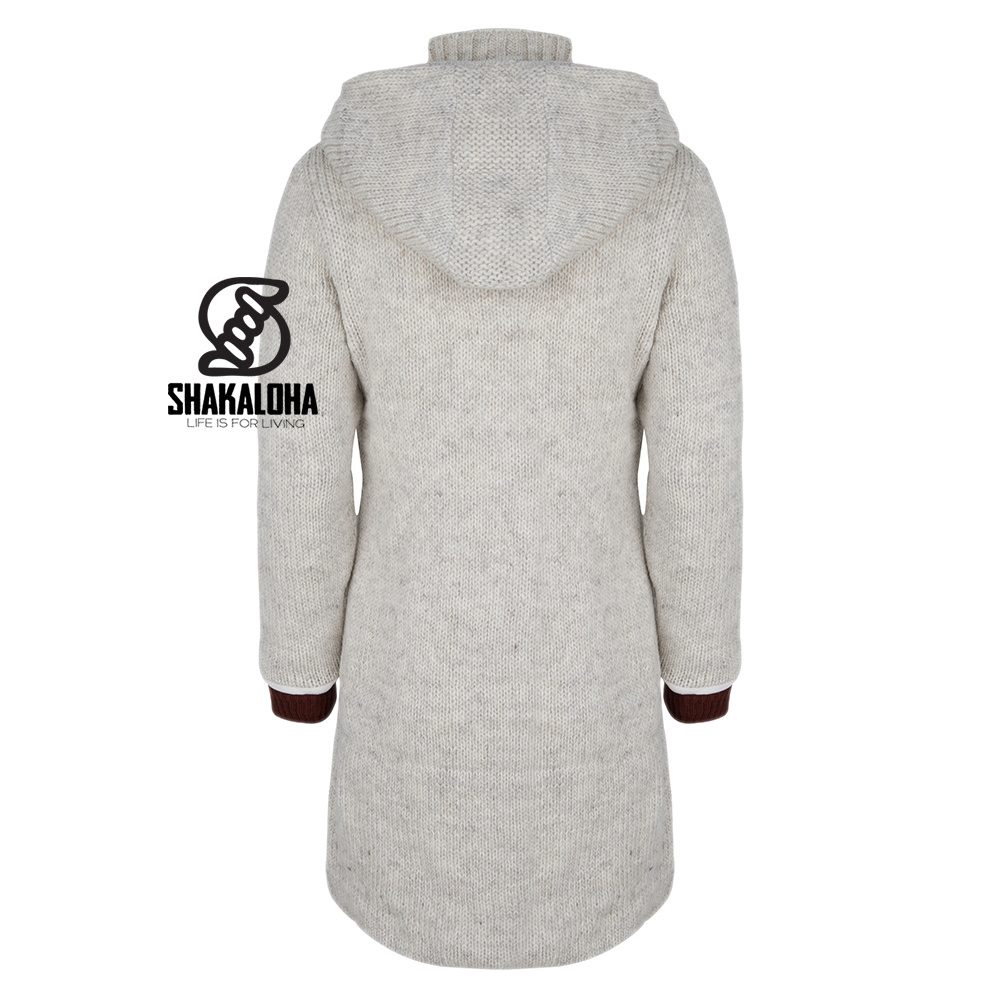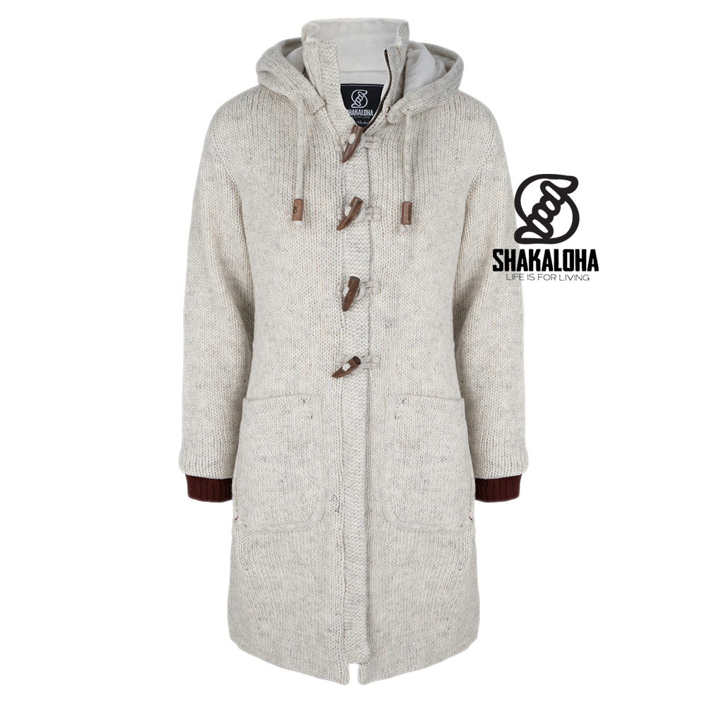 Questo cardigan beige da donna in lana extra lungo è dotato di fodera in pile, cappuccio staccabile e chiusura combinata con alamaro e robusta cerniera YKK. Il cardigan ha anche una tasca interna con cerniera e una manica interna marrone. Questo comodo cardigan è lavorato a maglia in 100% lana di pecora ed è meravigliosamente caldo per tutte le stagioni. Il modello Whistler è disponibile nelle taglie dalla S alla XXL nei colori antracite o beige. I cardigan Shakaloha sono realizzati in 100% lana di pecora neozelandese e sono prodotti in Nepal nel rispetto sia degli animali che dei lavoratori. I cardigan possono essere lavati con un po' di detersivo per lana a 30 gradi.
