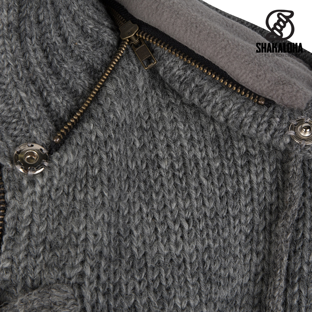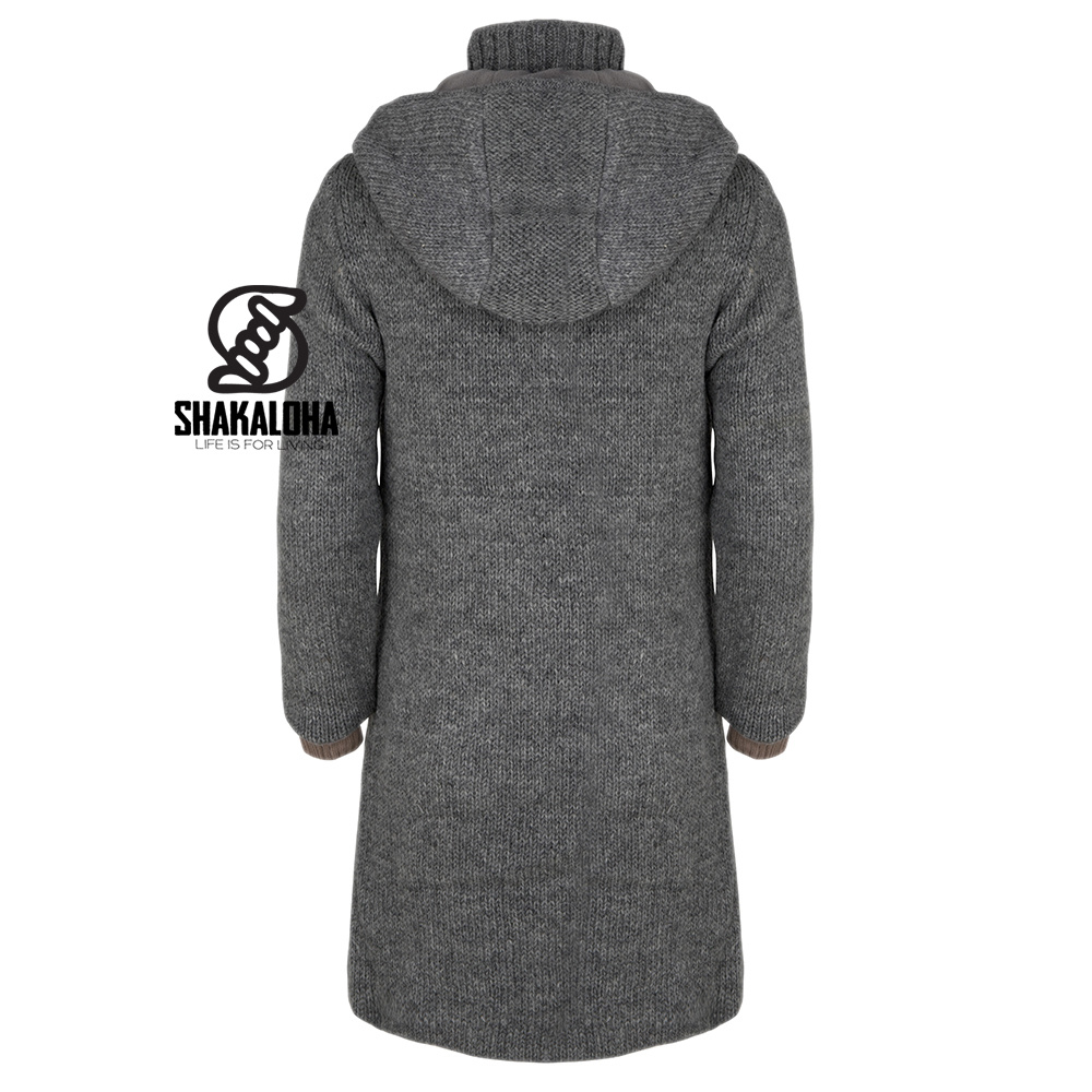 Cardigan da donna in lana extra-lungo Gris con fodera in pile, cappuccio staccabile e chiusura combinata con alamaro e robusta cerniera YKK. Il cardigan presenta anche una tasca interna con cerniera e una manica interna marrone. Questo comodo cardigan è lavorato a maglia in 100% lana di pecora ed è meravigliosamente caldo per tutte le stagioni. Il Whistler è disponibile nelle taglie dalla S alla XXL nei colori antracite o beige. I cardigan Shakaloha sono realizzati in 100% lana di pecora neozelandese e sono prodotti in Nepal nel rispetto sia degli animali che dei lavoratori. I cardigan possono essere lavati con un po' di detersivo per lana a 30 gradi.