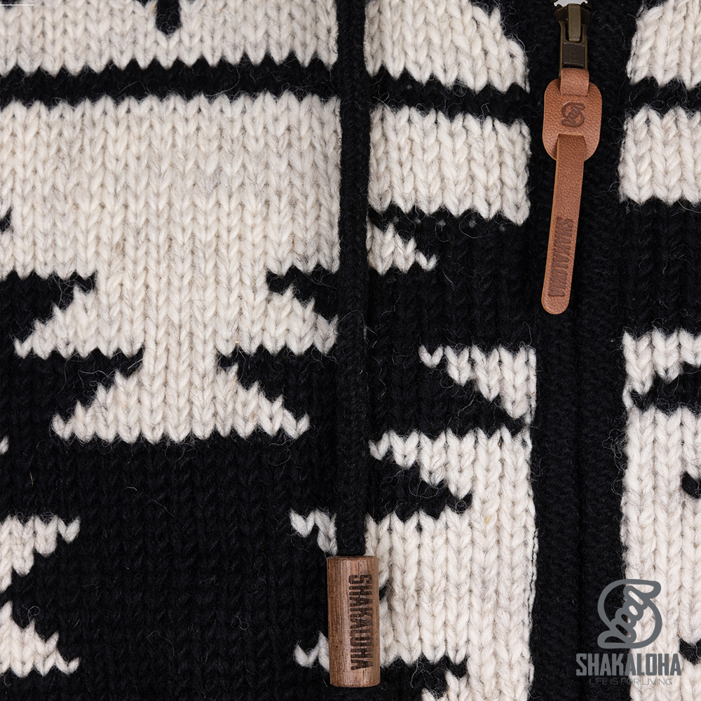Ontdek het Shakaloha wollen vest Oregon Black White, een handgemaakt jack van 100% schapenwol uit Nepal. Dit stoere zwart-witte vest heeft een opvallend geometrisch patroon en is volledig gevoerd met zachte fleece voor ultieme warmte en draagcomfort. Perfect als winterjas, buitenvest of casual hoodie voor koude dagen.