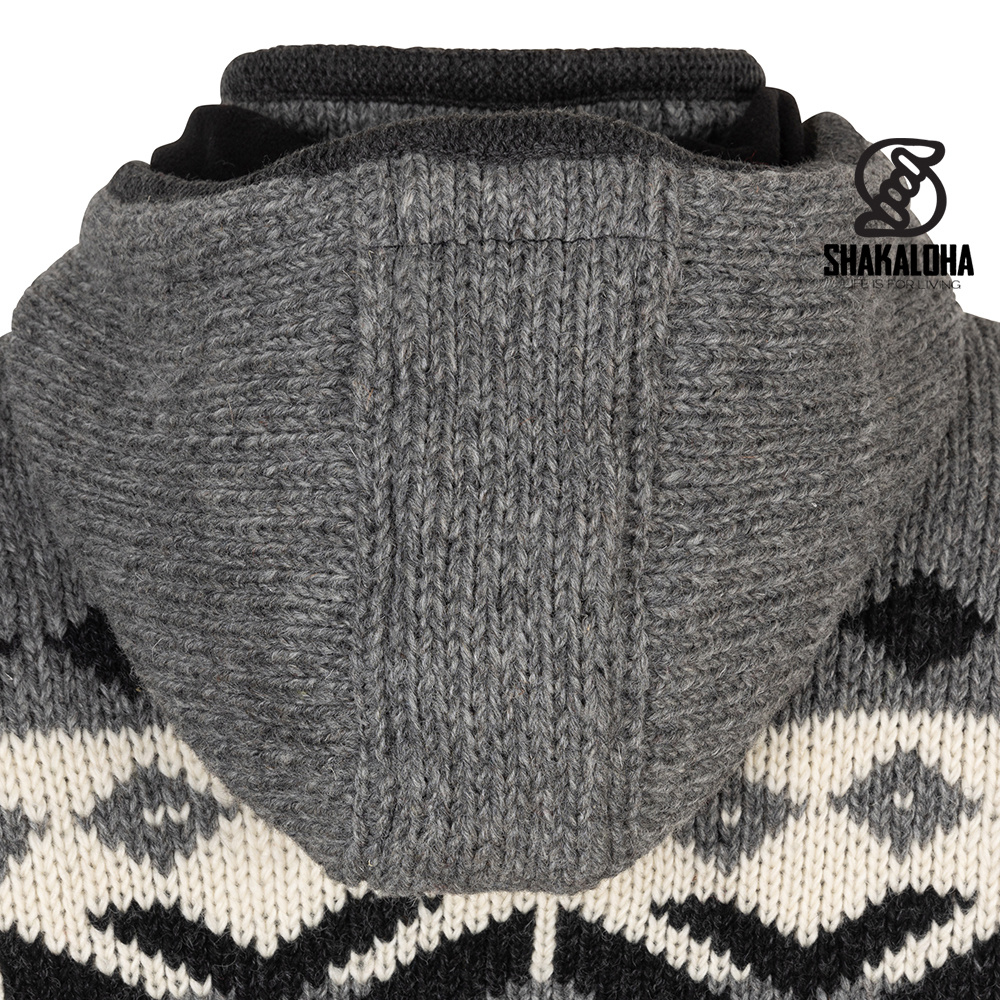 Klassiek gebreid wollen vest voor heren of uni, met fleece voering. Met noors breipatroon met de kleuren grijs, wit en zwart. Fleece gevoerd in body, zakken en in de afneembare capuchon.