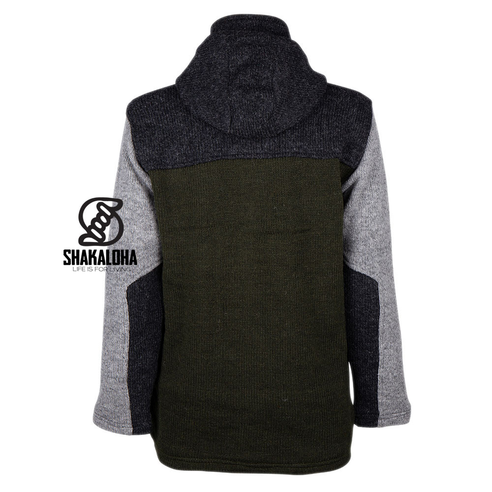 Gebreid Wollen Heren Vest in olijf groen met donker grijs, warm gevoerd met een rekbare fleece lining, zowel in de body, als ook in de capuchon en zakken. Uniek herenvest uit Nepal.