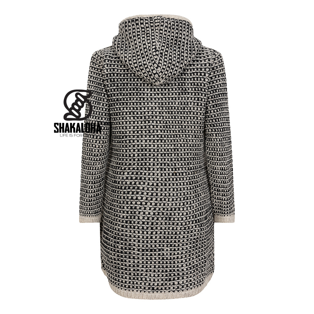 Shakaloha W Anzio Zwart/Wit is een lang handgebreid damesvest van schapenwol met zachte fleecevoering voor knusse, ademende warmte.